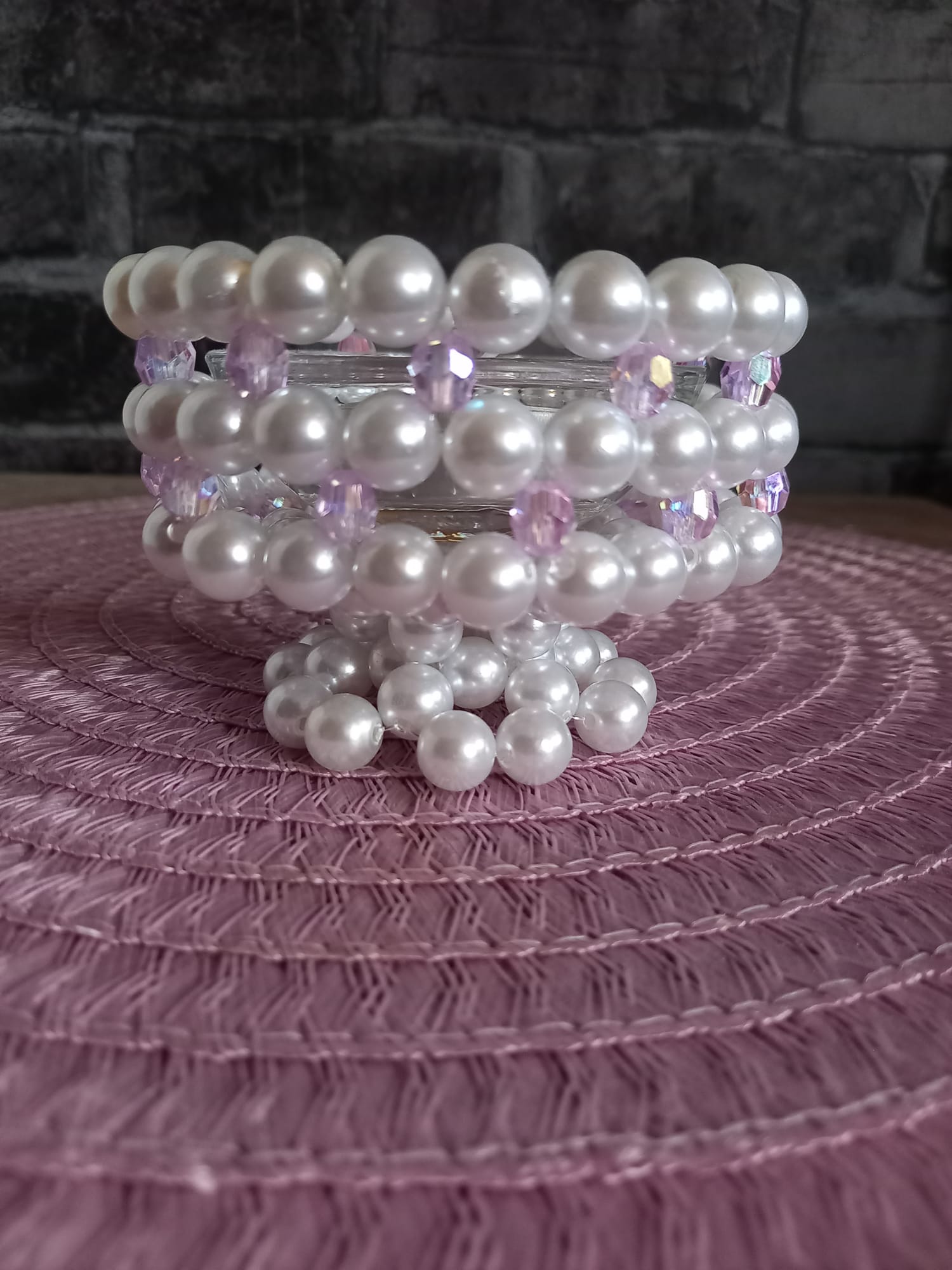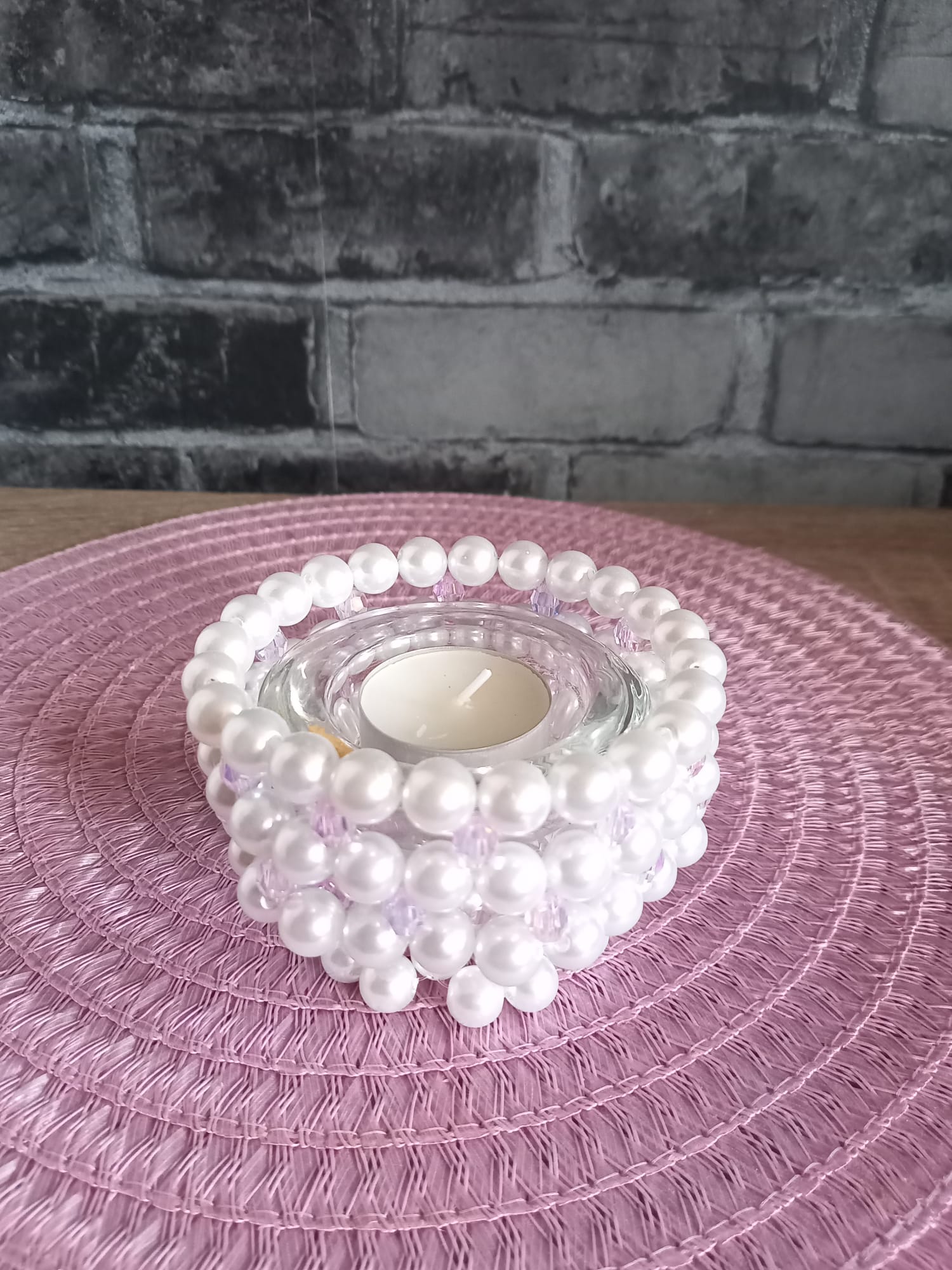 Dekorativer Kerzenhalter aus hochwertigen Perlen, liebevoll von Hand gefertigt. Die Kombination aus glänzenden Perlen und facettierten Zwischenperlen verleiht dem Halter einen edlen, funkelnden Look.